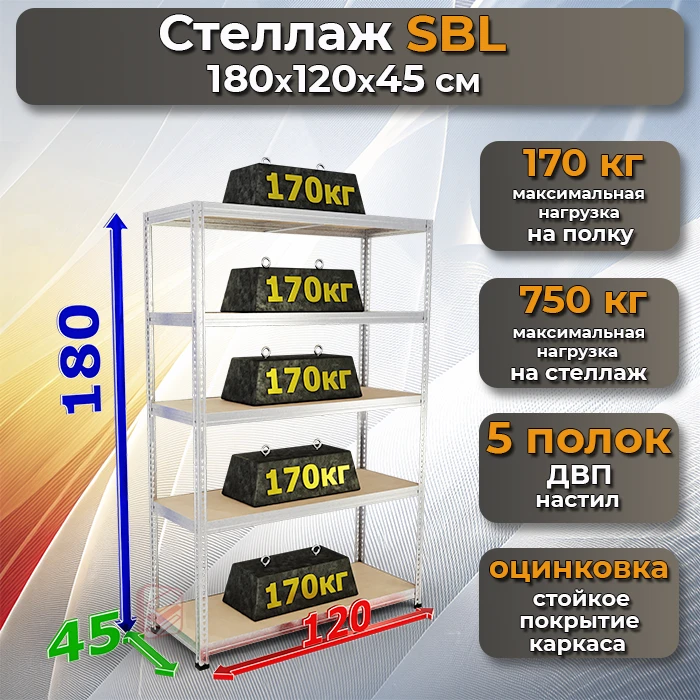 Стеллаж металлический с оцинковкой SBL 180х120х45 5 полок – прочное и удобное решение для организации хранения в гараже, мастерской, доме, офисе или на складе. Благодаря оцинкованному покрытию конструкция устойчива к коррозии и долговечна, а нагрузка до 170 кг на полку позволяет размещать тяжелые предметы.
