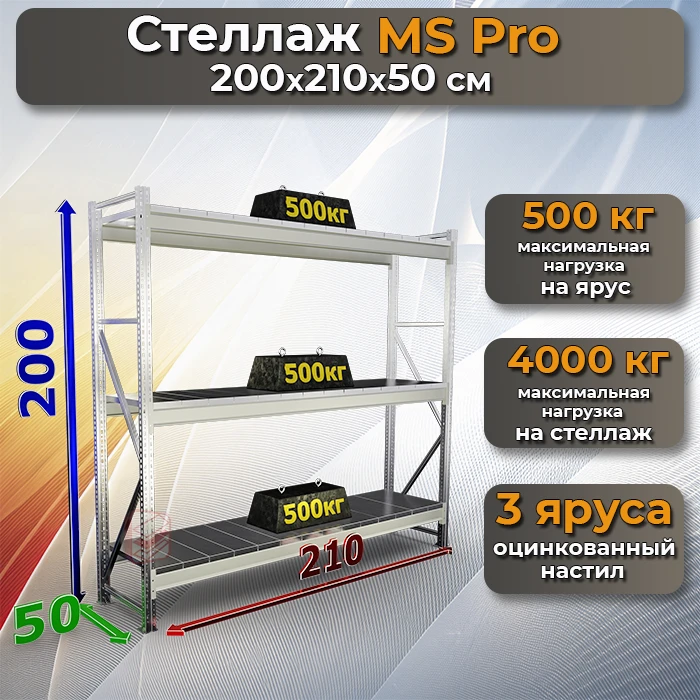 Среднегрузовой металлический стеллаж MS Pro 200х210х50 с 3 полками — надежное решение для организации хранения на складах, в гаражах, кладовых и торговых помещениях.