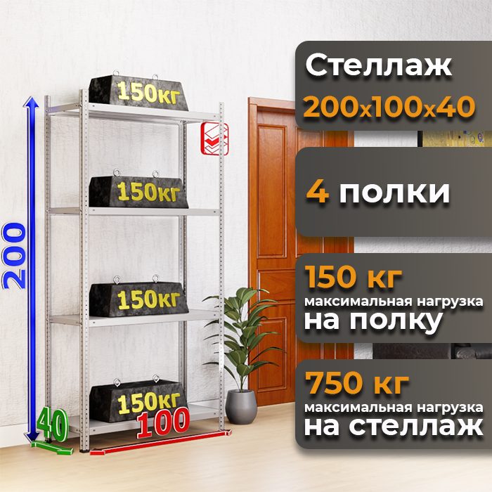 Стеллаж складской металлический высотой 200 см, шириной 100 см, глубиной 50 см, с четырьмя полками и максимальной нагрузкой до 150 кг, купить в Москве ;